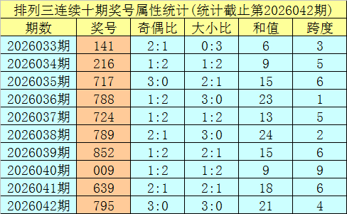 上期回顾:排列三第2026042期奖号:795。类型:组六,奇偶形态:奇奇奇,大小形态:大大大,和值:21,跨度:4。